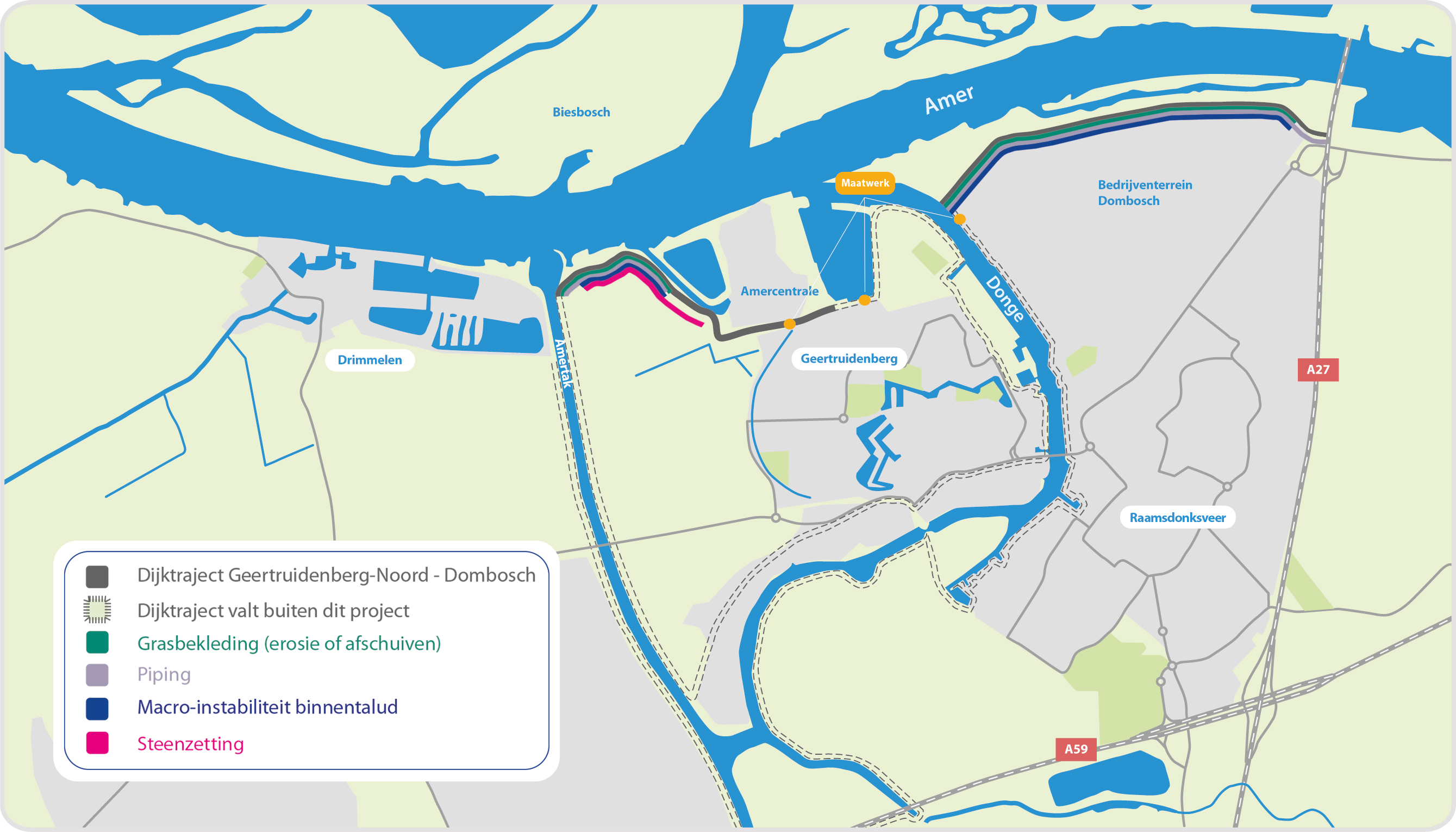 Ruim 3 kilometer van de dijk voldoet niet aan de veiligheidseisen. Het gaat hierbij om het dijktraject ten noorden van Geertruidenberg langs de Amercentrale en ten noorden van industrieterrein Dombosch. Dat betekent niet dat de dijk nu niet veilig is, maar dat de dijk voorbereid moet worden op veranderende (klimaat)omstandigheden. Want door klimaatverandering worden we steeds vaker geconfronteerd met extreme weersomstandigheden: droogte én wateroverlast. Ook in Brabant is dit het geval. Om goed voorbereid te zijn op de toekomst, zijn sterke dijken van belang. Want onze dijken beschermen ons tegen overstromingen.