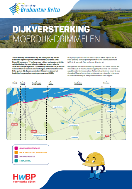 De dijkversterking Moerdijk-Drimmelen is onderdeel van het landelijke Hoogwaterbeschermingsprogramma. In het Hoogwaterbeschermingsprogramma werken de waterschappen en Rijkswaterstaat samen aan de grootste dijkversterkingsoperatie ooit sinds de Deltawerken. Minimaal 1.400 kilometer dijken en daarnaast 400 sluizen en gemalen, worden de komende dertig jaar versterkt. Zo werken we aan een land waar je veilig kunt wonen, werken en recreëren.