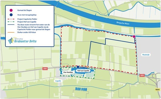 Het water in de waterplas van de coöperatie Hof van Capelle staat regelmatig hoger dan volgens het peil wenselijk is. Het water uit het gebied stroomt nu onder de A59 door naar de Capelsche Polder, maar dat is niet genoeg. Ook bewoners van Vier Heultjes hebben last van wateroverlast na hevige regen. De afwateringsrichting in dit gebied is eerder omgedraaid. Daardoor is de afstand tot gemaal De Slagen groter geworden. Het water doet er nu langer over om weg te stromen. Daarnaast loopt het water in de sloot langs de A59 niet goed door. Er spoelt zand in de sloot en onderhoud is lastig, omdat de sloot tussen de geluidswal en de waterplas ligt.