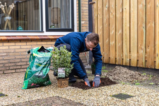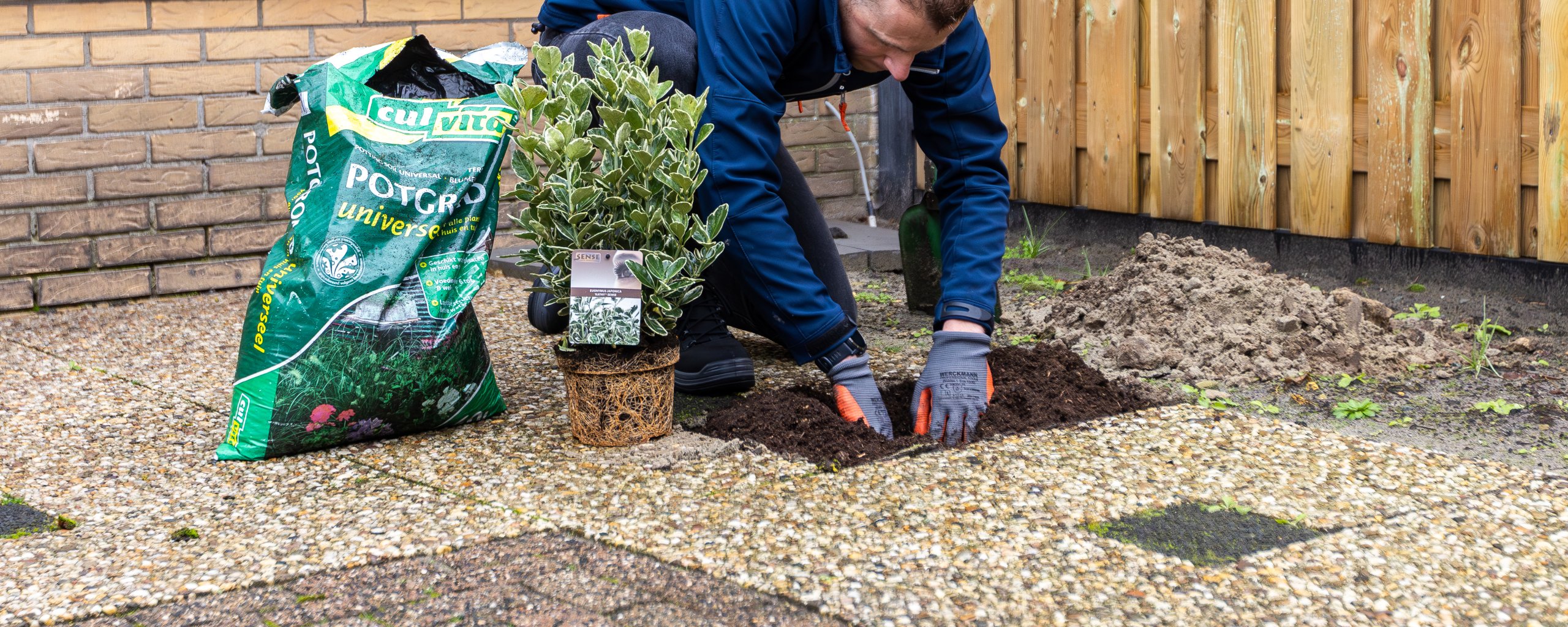 Haal de plant uit de pot, zet deze in het gat en vul met aarde. Druk de grond rondom de plant aan zodat hij goed vaststaat.