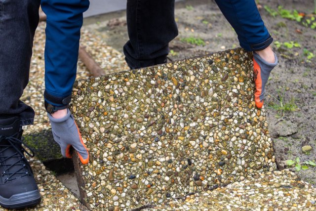 Gebruik een spade of platte schoffel om de tegel voorzichtig los te wrikken. Til de tegel eruit en leg hem op een veilige plek.