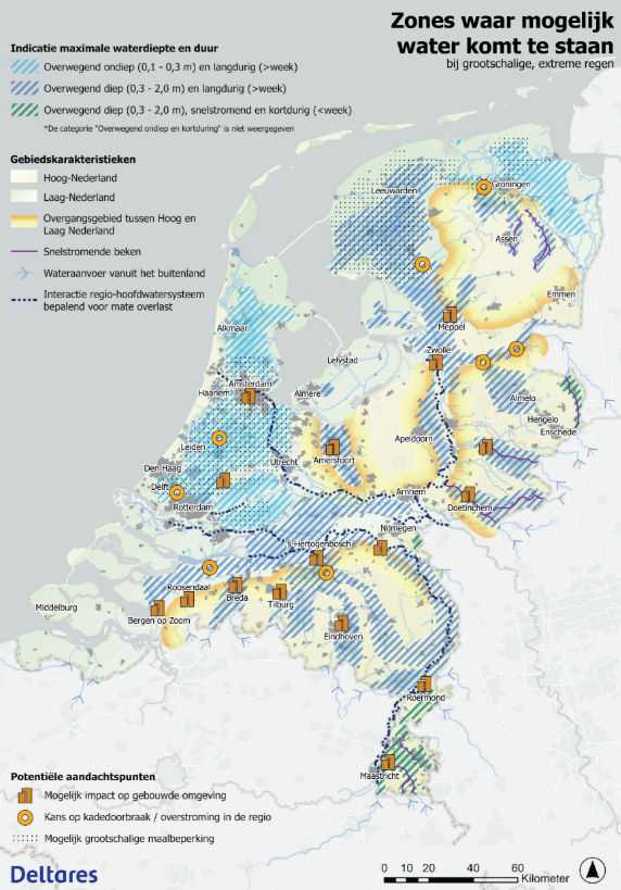 De Klimaateffectatlas laat zien waar wateroverlast kan ontstaan als sloten en beken overstromen door extreme regen. Dat is vooral zichtbaar buiten stedelijk gebied. Maar ook in steden zorgt zo’n bui zeker voor wateroverlast, bijvoorbeeld doordat straten en kelders kunnen onderlopen.