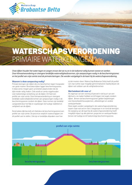 Onze dijken houden het water tegen en zorgen ervoor dat we nu en in de toekomst veilig kunnen wonen en werken. Door klimaatverandering en strengere landelijke waterveiligheidsnormen, zijn aanpassingen nodig in de beschermingszones en het profiel van vrije ruimte rond de primaire keringen. Die worden vastgelegd in de kaart bij de waterschapsverordening.